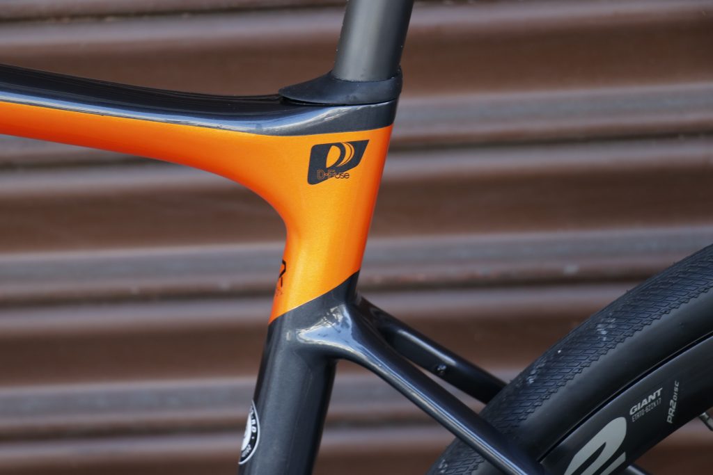 ヘッドチューブも上が1-1/8(オーバーサイズ)、下が1-1/4とレーシングなモデルよりも細身でしなやかさを出してあります。