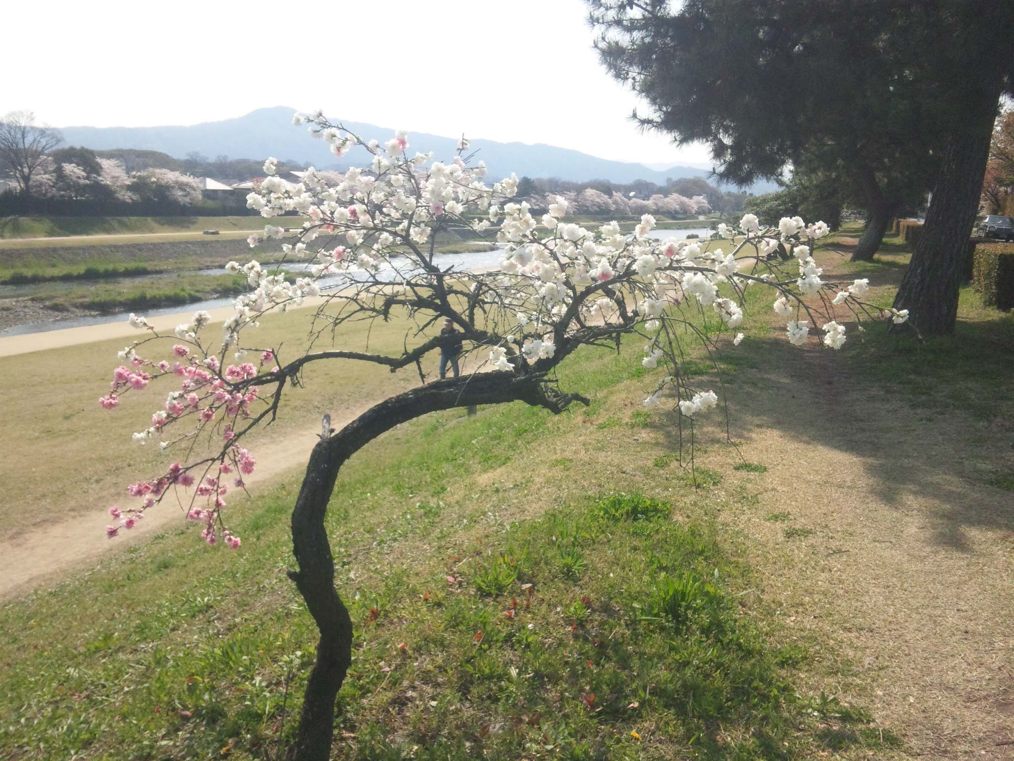 因みに僕の一番お気に入りの桜は、出雲路橋と今出川の間にある、紅白の花が咲くこの小さいの。