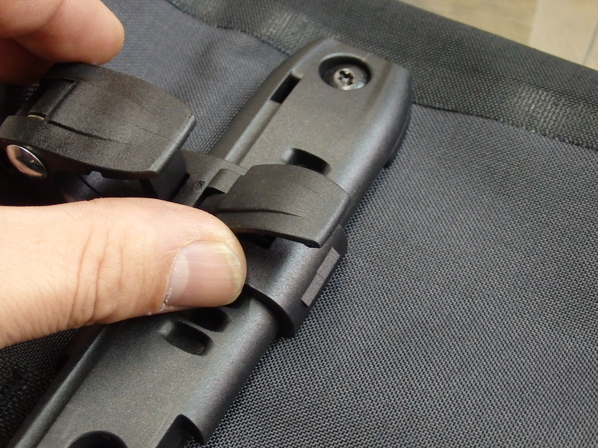 ハンドルを持ち上げることでフックの中の爪が動き、ワンアクションでキャリアへのスムーズな取り付け、取り外しができる機構です。