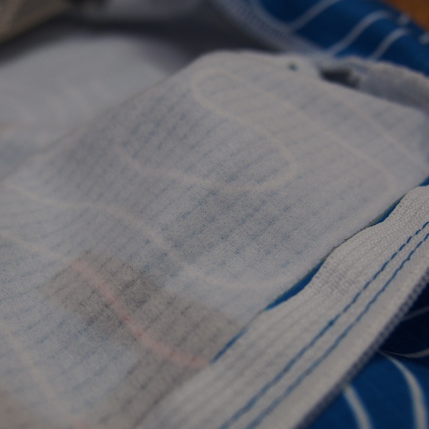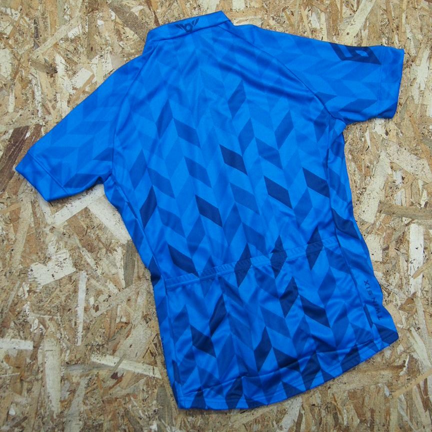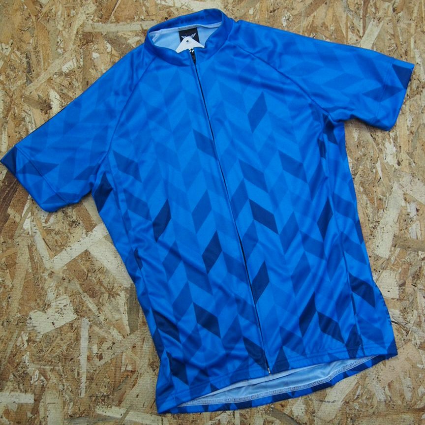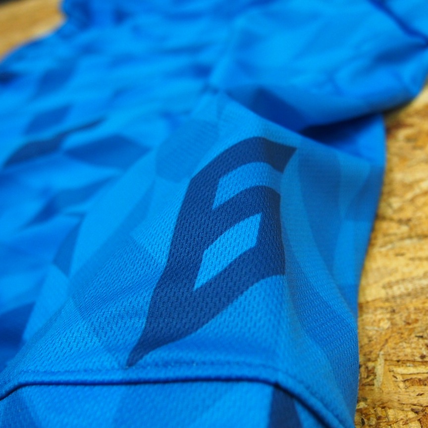 オプティカルな模様と同じ青でもトーンを多く使うことにより奥行きあるテキスタイルになっておりますね。レーサー系にはないテキスタイルでステキです。
