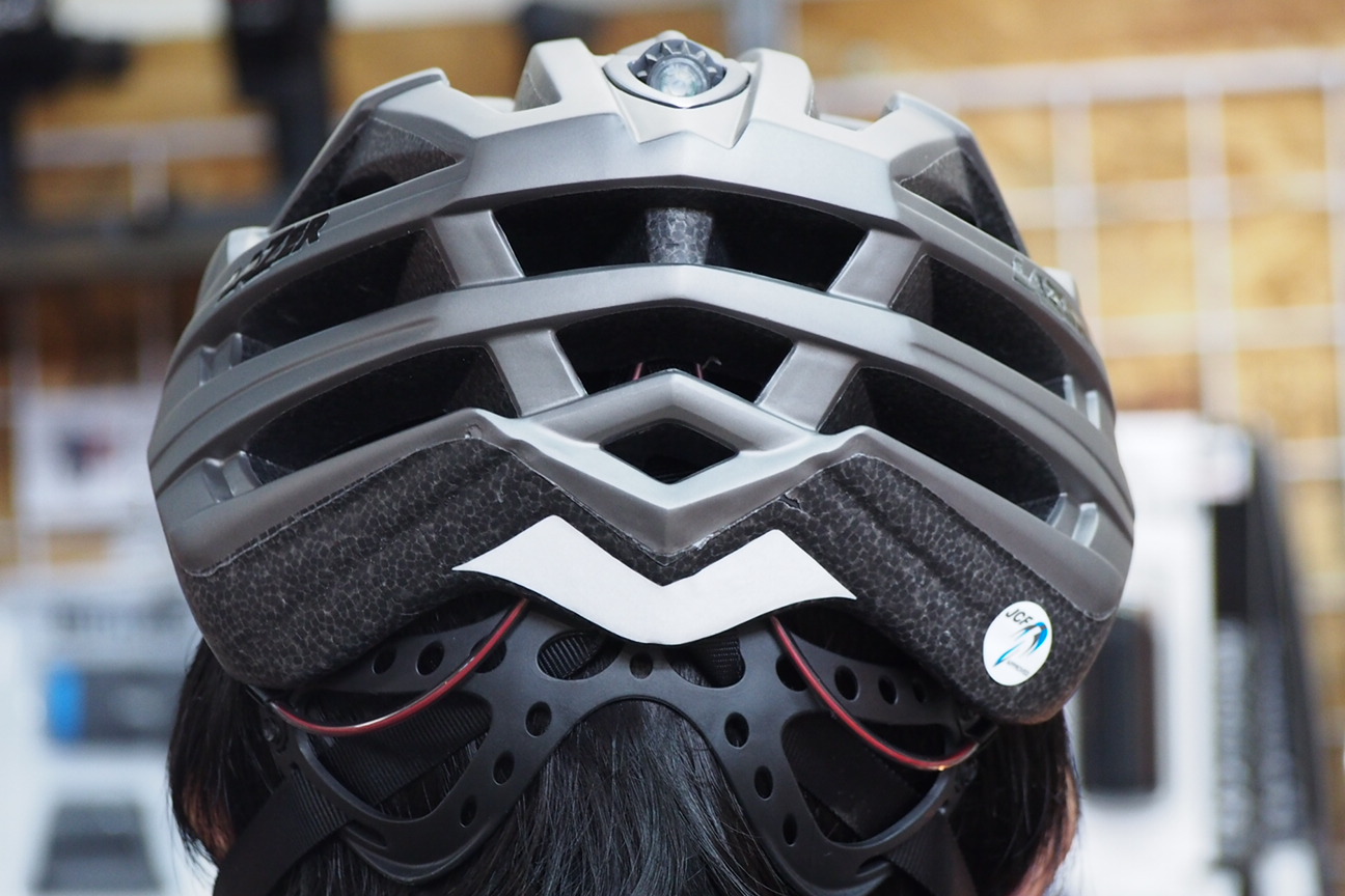 後頭部にアジャストダイヤルがあるのが一般的ですが、LAZERは頭頂部にダイヤルがあり手が届きやすく調整がしやすいです。