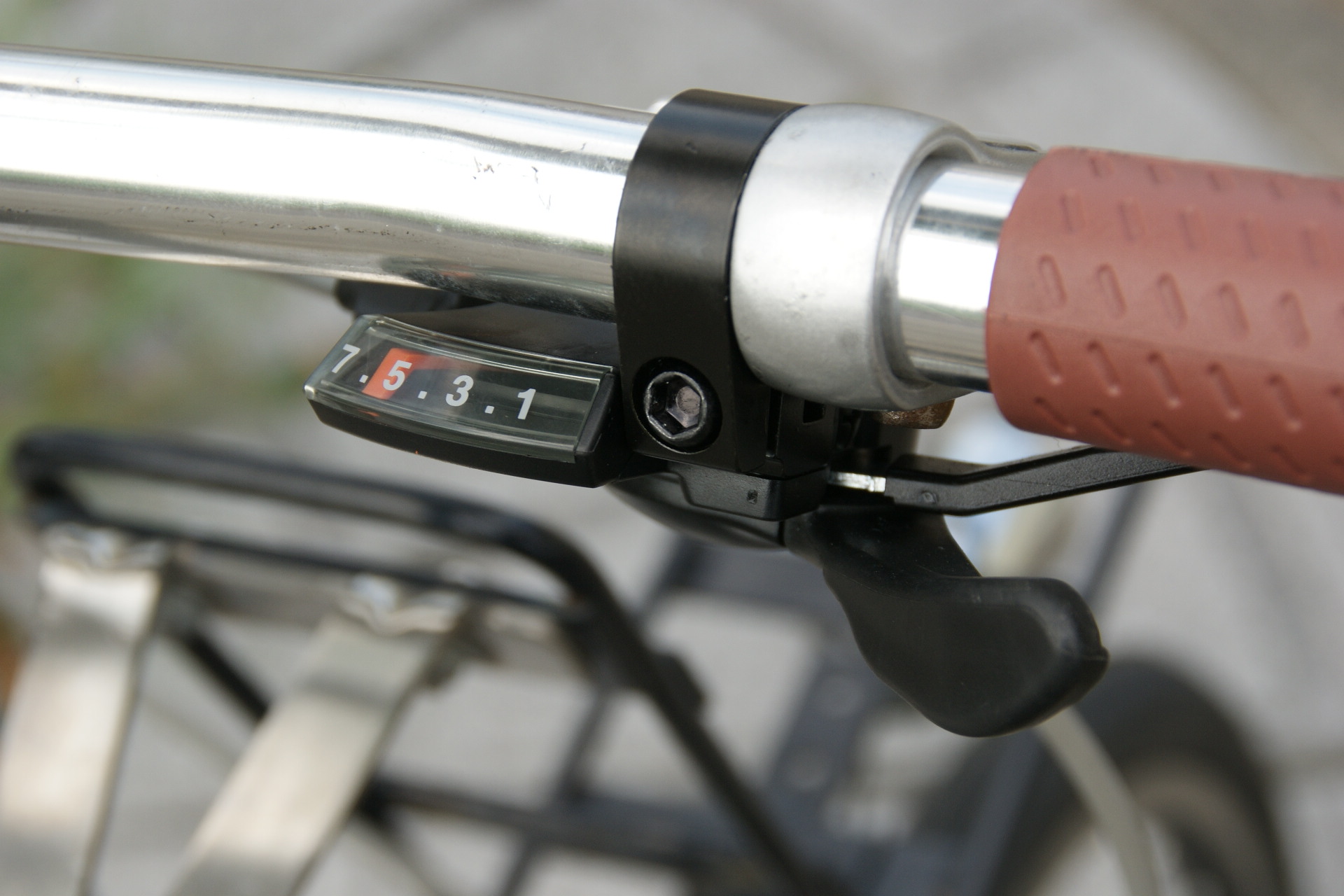 ハンドルはフラットタイプです。変速は7段変速と充実機能になっています。変速機がラピッドファイヤー式になっていますのでキビキビ変速できるようになっています。