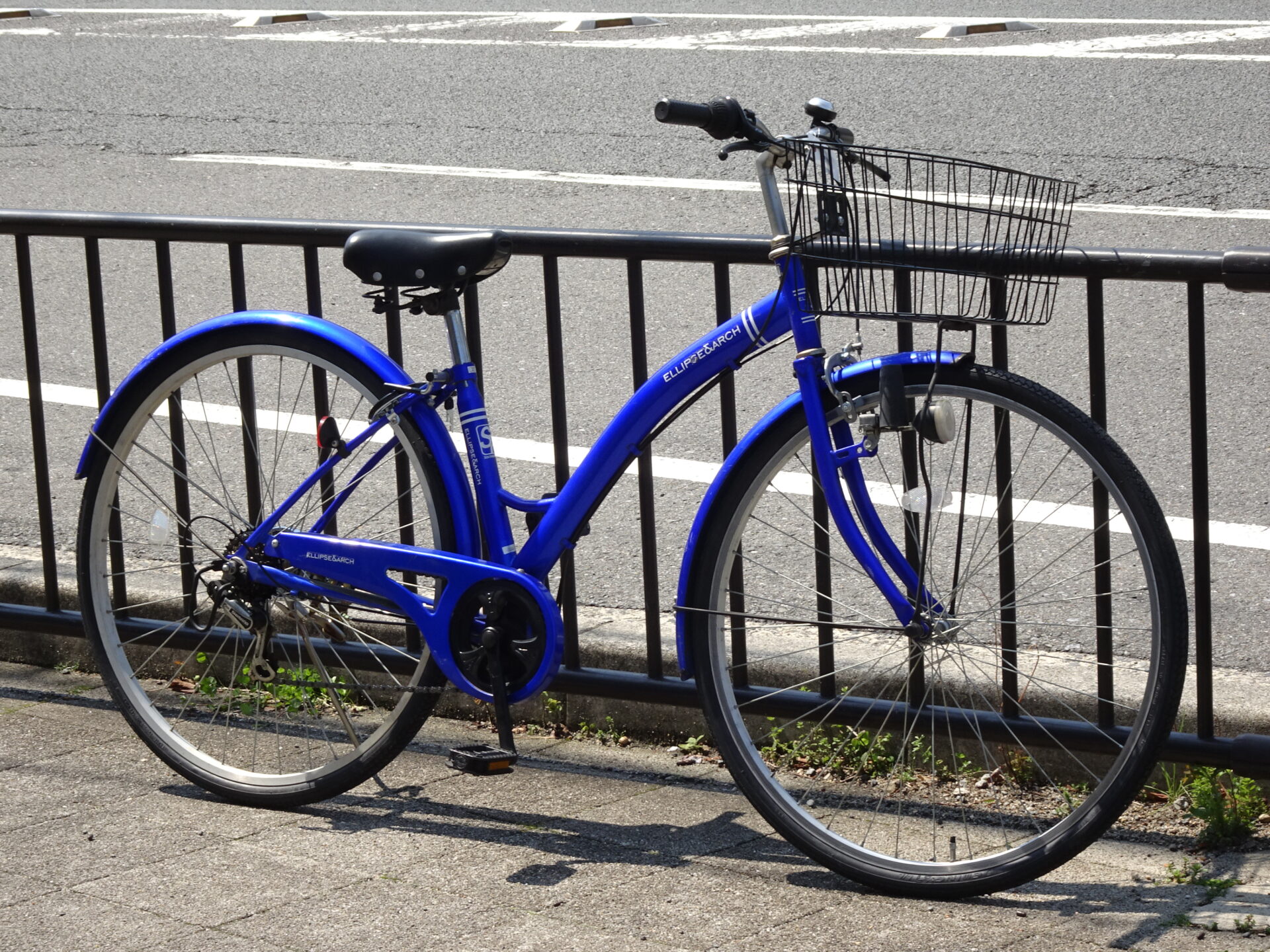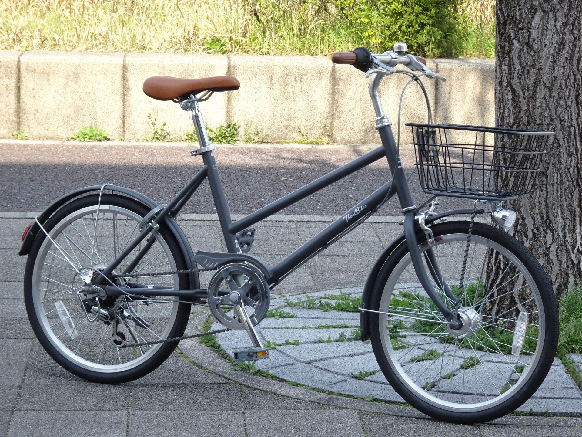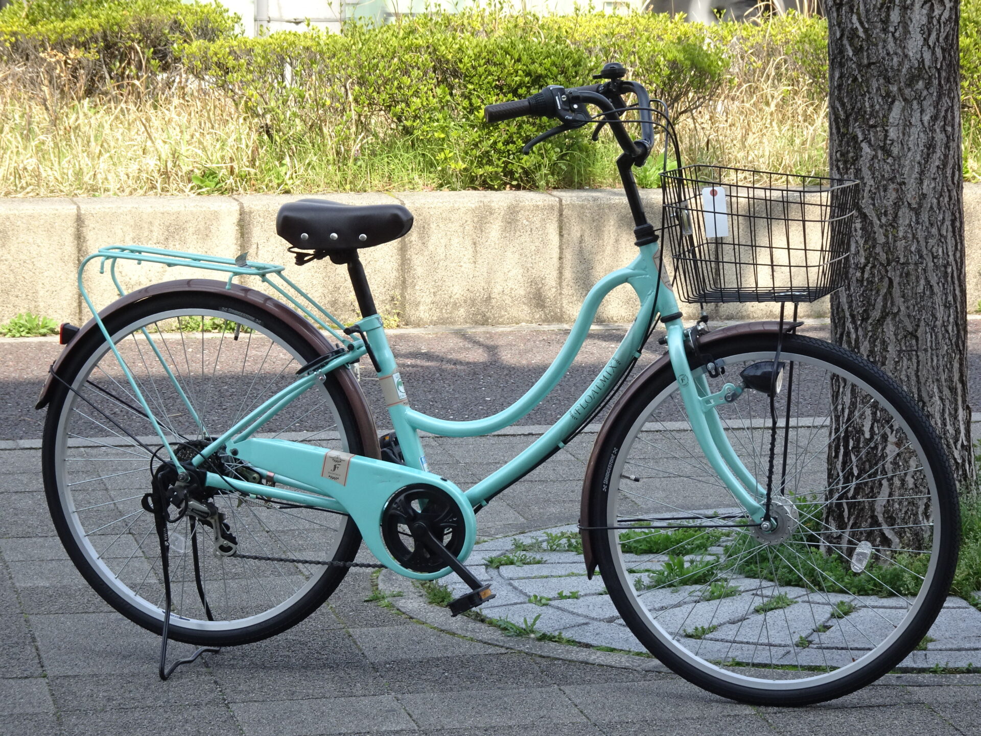太いタイヤが特徴的なシティサイクル。横幅のあるカゴも魅力的。