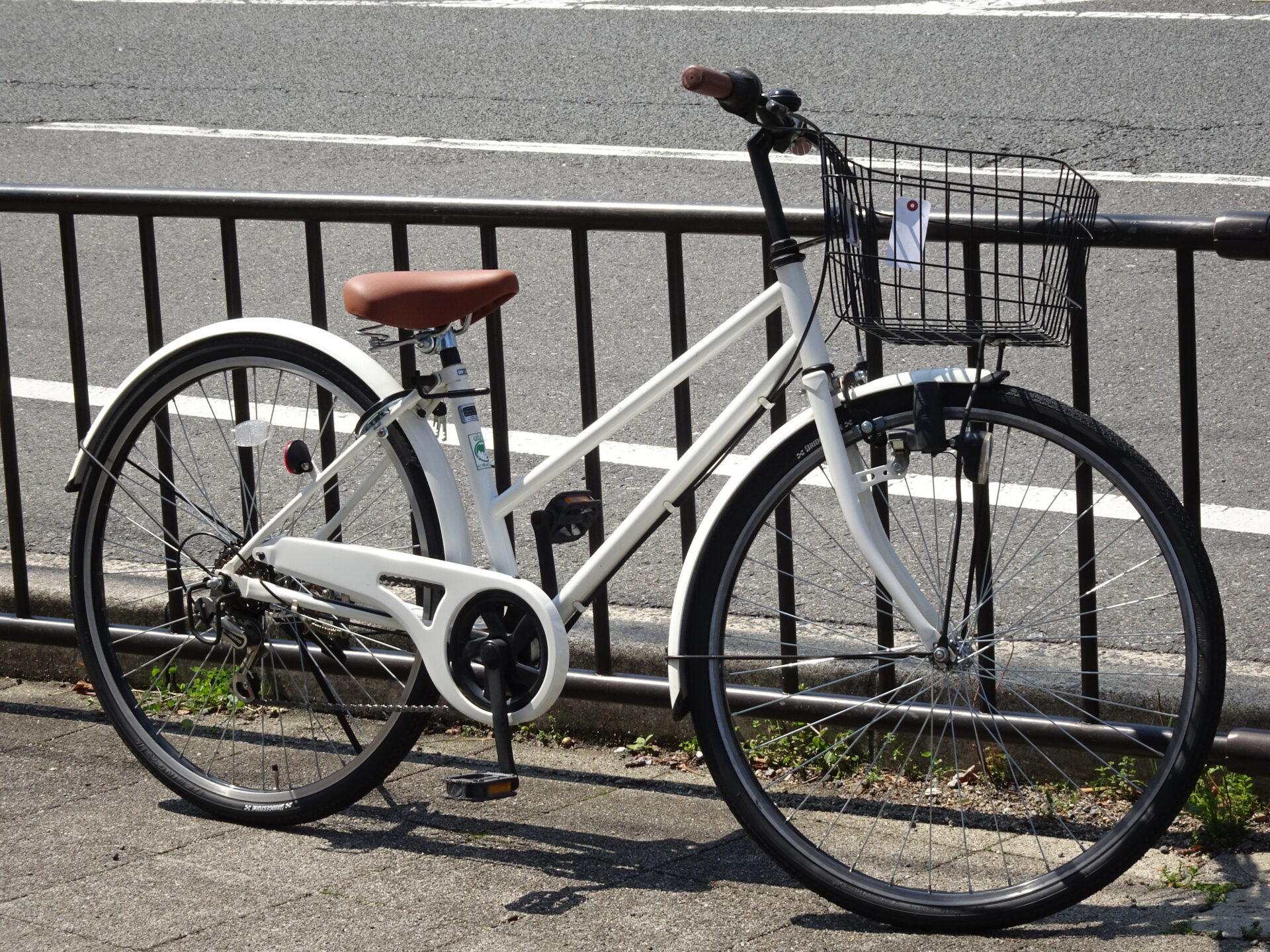 シティーサイクルに6段変速がついたシンプル仕様の自転車。白い車体に茶色のグリップ、サドルが印象的です。