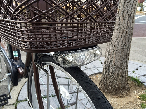 樹脂製の純正カゴはカバンなどがキズつきにくい工夫が施され、カゴ下には2LEDのバッテリーライトがついてます。これはタイヤ影が映りません!しかもバッテリーがなくなっても別電源を利用してますので点灯する事ができます。