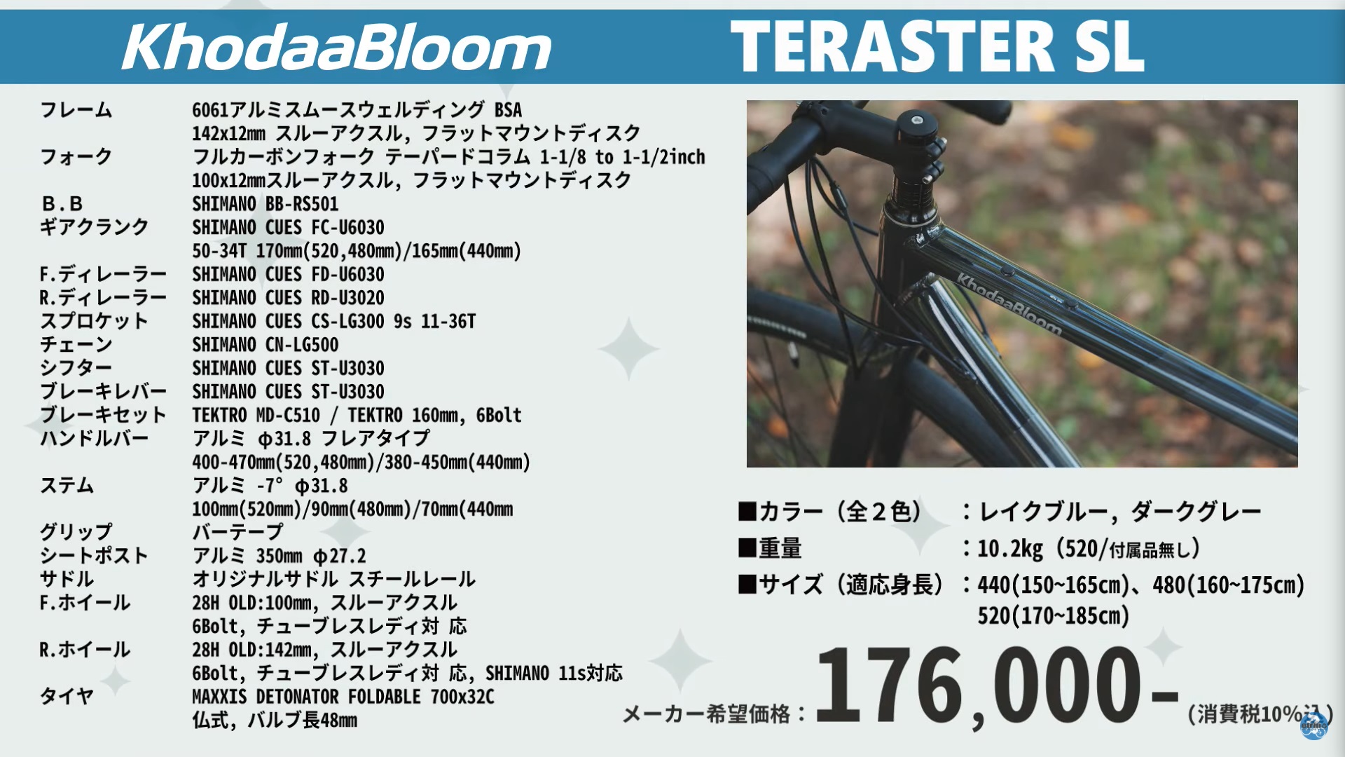 ホーム エイリンBLOG エイリン公式YouTubeチャンネル情報 2026 KhodaaBloom TERASTER SL|“気軽にロードを楽しむ”新世代オールロード 2026 KhodaaBloom TERASTER SL|“気軽にロードを楽しむ”新世代オールロード 2025.12.21 店舗: カテゴリ:エイリン公式YouTubeチャンネル情報 こんにちは!エイリンのリッキーです! 今回紹介するYouTube動画は、KhodaaBloomの2026年新作「TERASTER SL」です! ちょっとした砂利道も走れる、太めタイヤと安定設計。キャリアや泥除けフェンダー等を取り付けられる多くのボルト台座。 オールマイティなロードバイク “オールロード” がKhodaaBloomの新作として登場しました! 展示会で、試走してきた感じも動画内ではお伝えしております! 入荷は春頃予定となります! 是非、視聴してくださーい! ▼関連記事 京都の自転車屋 CYCLE SHOP eirin & サイクルハテナ日本の街にフィットする新世代ロード|2026.KhodaaBloom TERASTER SLKhodaaBloomの新作TERASTER SLを展示会で試乗。ロードの軽快さとグラベル的な安心感を両立した“万能オールロード”を徹底レビュー。 ▼商品ページ 京都の自転車屋 CYCLE SHOP eirin & サイクルハテナKhodaaBloom / *【2026年モデル】TERASTER SL自由なライドを楽しむ「2026 KhodaaBloom TERASTER SL」。 32cタイヤとディスクブレーキで安心感抜群、積載性の高い設計でツーリングから日常まで快適に走れるオールロードです。 Tweet この記事への問い合わせ 近くの店舗を調べる 人気ブログ記事 2025.12.16 【中古自転車情報】12/16更新~お求めやすい中古自転車の在庫情報です! 2025.11.30 【2025年11月】中古スポーツバイク&ミニベロ 五条東洞院店・店頭在庫まとめ! 2025.11.05 アメリカ・カリフォルニア発・次世代カーゴバイク【ATMOSE(アトモーズ) Haul’r P1】が描く~自転車の新しい日常~ 2020.02.10 【メンテナンス】Shimano油圧ディスクブレーキホース交換とブリーディングに挑戦してみよう! 2025.09.29 【FUJI / フジ 2025年モデル 】STAUT(スタウト)レビュー!街乗りもアウトドアも楽しめるクロモリ・ミニベロ